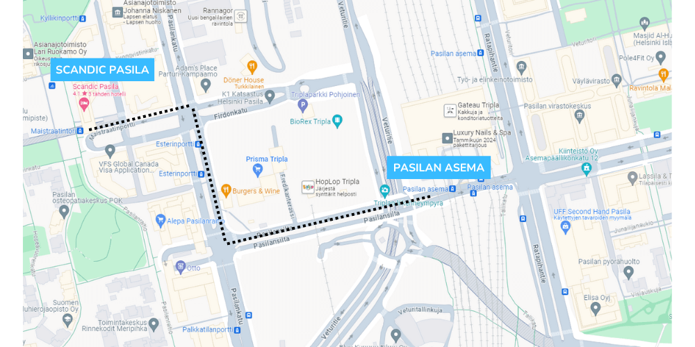 Scandic Pasila sijaitsee hyvin kulkuyhteyksien varrella lähellä Pasilan juna-asemaa, josta on lyhyt kävelymatka hotellille (katso kuva alla).